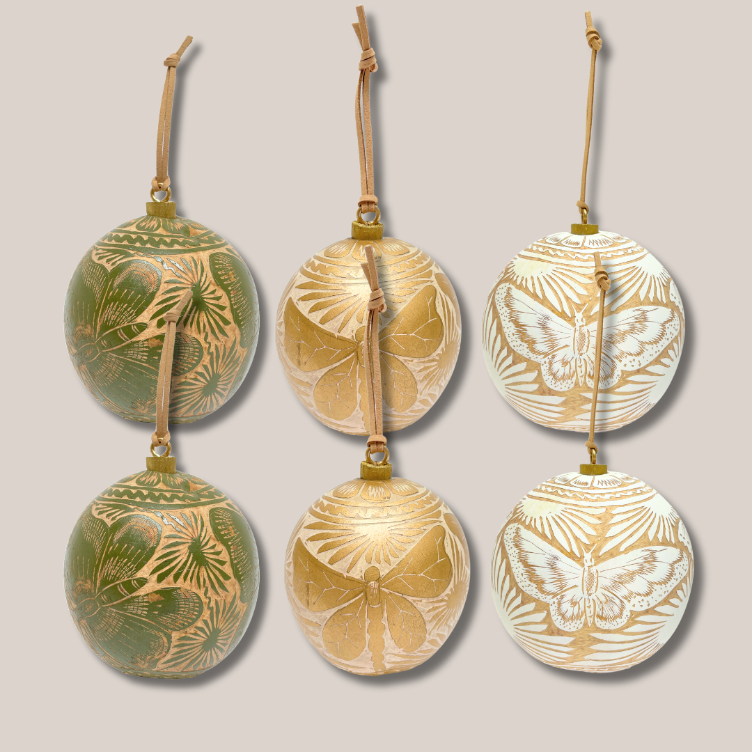 6 x ESFERAS TALLADAS: Verde olivo, oro viejo y blanco perla