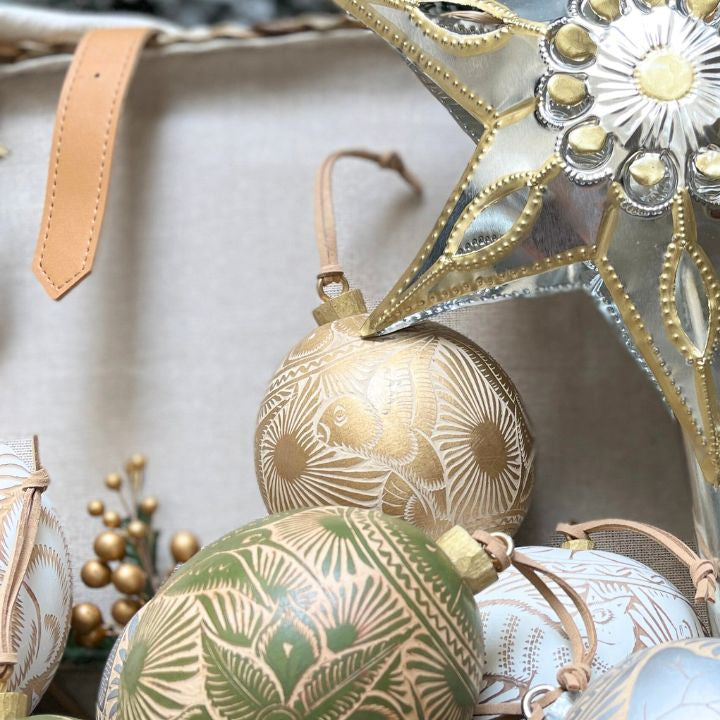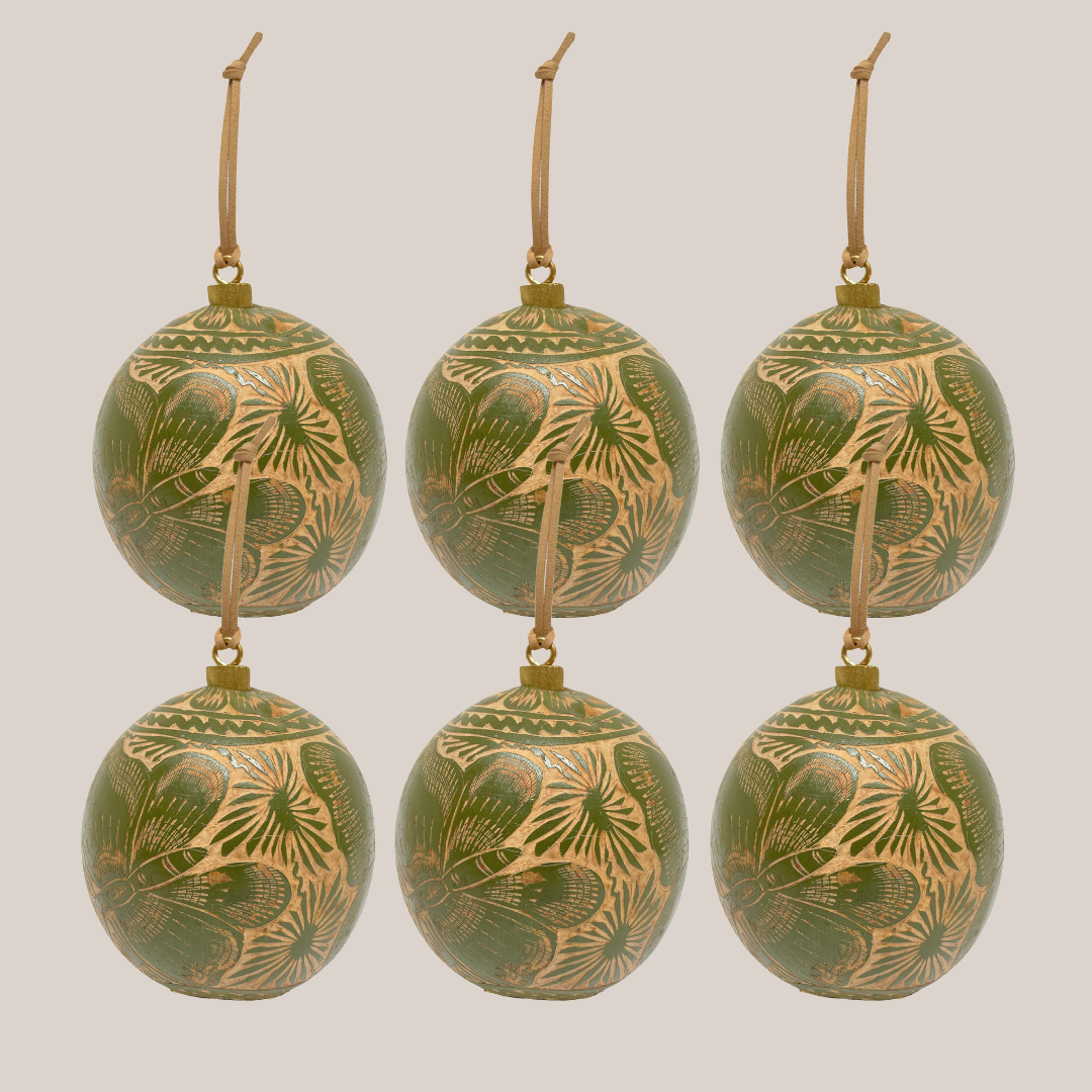 Estas bellas esferas 100% naturales tienen su origen en el árbol crescentia crujete, mejor conocido como “árbol de jícara”, presente en la Región Costa de Oaxaca. Para la elaboración de cada pieza, el fruto es pintado y tallado a mano, representando fauna y flora local.